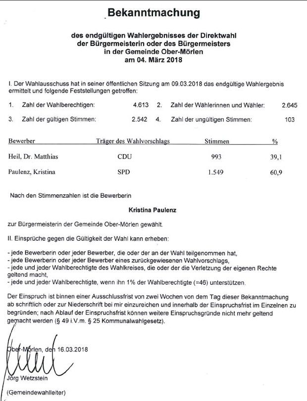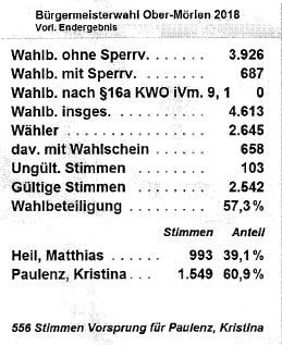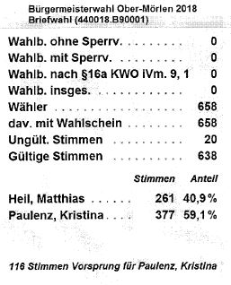 Die einzelnen Ergebnisse der Bürgermeisterwahl vom 4.3.2018