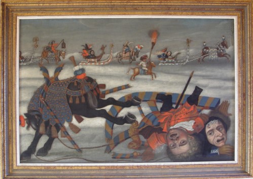 Das scheuende Pferd im unteren Teil des Bildes steht in wunderbarer Komposition zu dem umgestürzten Schlitten.