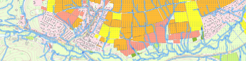 Die Darstellung der landwirtschaftlichen Fläche unterscheidet zunächst einmal zwischen Ackerland und Grünland. Ackerland wird in weitere vier Klassen eingeteilt. Diese reichen von „wenig gefährdet; Hangneigung <5 %“ (gelb) bis zu „sehr stark gefährdet; Hangneigung >20 %“ (rot). Grünland ist im Allgemeinen weniger gefährdet als Ackerland, da der Boden eine deutlich höhere Bedeckung hat und somit Wasser und Boden besser zurückgehalten werden. Grünland wird in drei Klassen gegliedert, die von „nicht gefährdet; Hangneigung < 10 %“ (hellgrün) bis zu „mäßig gefährdet; Hangneigung > 20 %“ (dunkelgrün) gestuft sind. Im Wald sind die Fließpfade eingezeichnet, jedoch wird keine Gefährdungseinschätzung gegeben. Hierbei wird von einem gesunden Wald ausgegangen, der gute Versickerungseigenschaften hat. Waldflächen, die brachliegen, können aber durchaus eine Erosionsgefährdung mit sich bringen. Dies gilt es zu beachten.