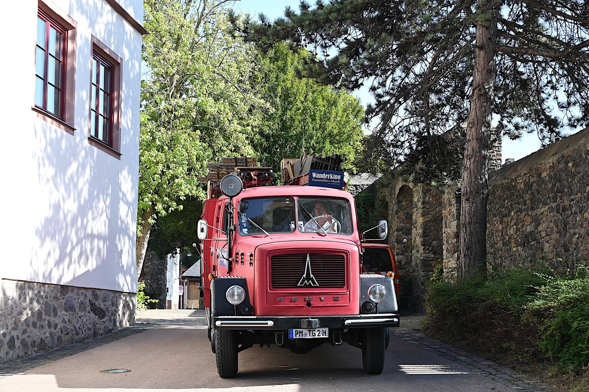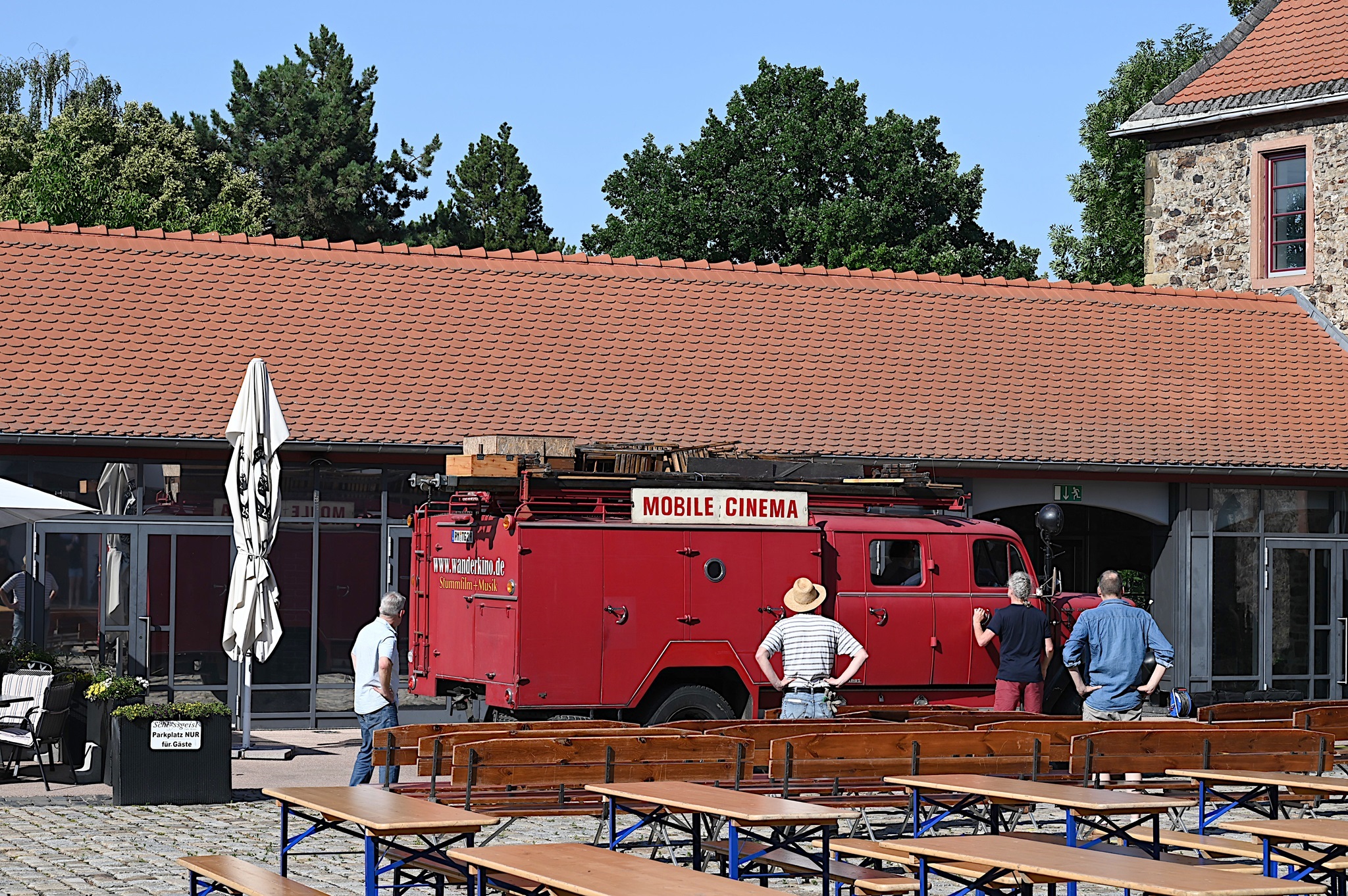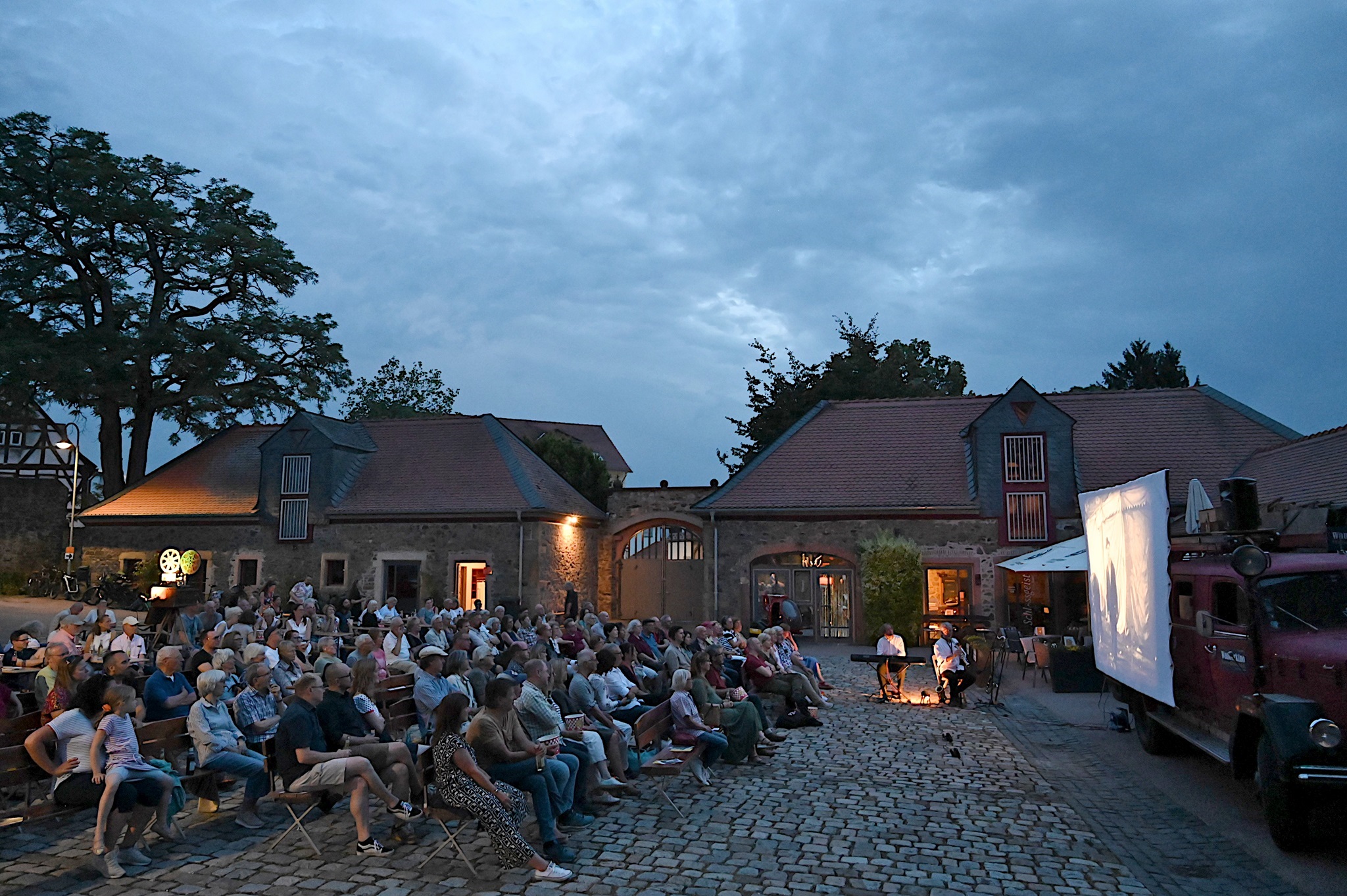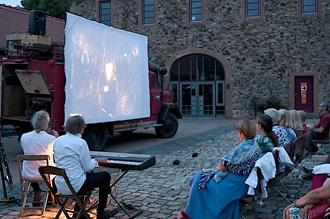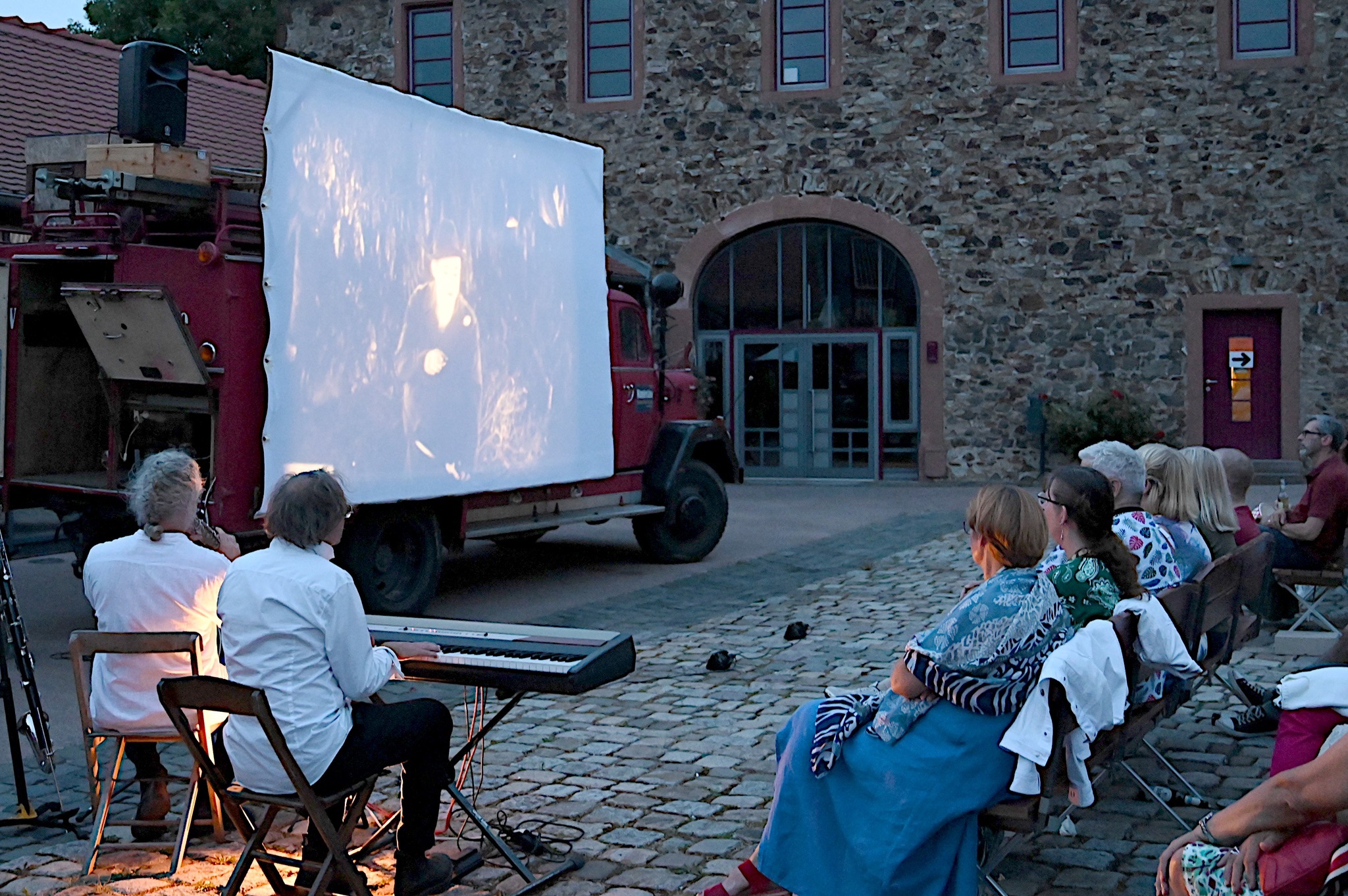Kaum ist das Vorprogramm verklungen, wird es rund um das historische Feuerwehrauto lebendig. An seiner Seite wird ein Holzrahmen auf- und mit einer blütenweißen Leinwand bespannt. Kaum haben Tobias Rank und Sebastian Pank dann auch den 16-mm-Filmprojektor auf seinem hölzernen Stativ befestigt und einen Instrumentenpark aus Piano, Saxophonen und Bassklarinette neben ihrem roten „Laster der Nacht“ aufgebaut, hüllt sich der Schlosshof in verheißungsvolle Dämmerung. Der Projektor beginnt zu rattern, auf der Leinwand lernen die Bilder das Laufen wie vor hundert Jahren und die beiden Vollblutmusiker hauchen einem Potpourri aus Stummfilmklassikern Leben ein.