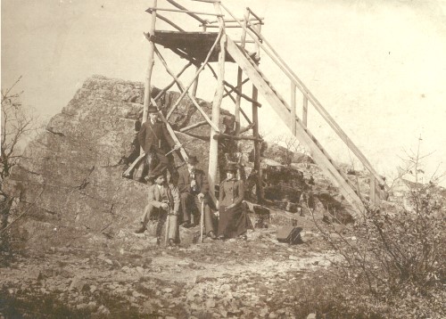 Auf den glitschigen Felsen, auf denen einst der Turm Halt fand, postierte sich diesmal Walter Müller, der Trompeter vom Philippseck. Seine Melodien schallten bis weit ins Tal hinein und wiesen so manchem Wanderer den rechten Weg. Oben angekommen, versüßte ihm Inge Rack aus Nieder-Mörlen den Aufenthalt mit ihrer Drehorgel, die sie im Heck eines Kleintransporters vor der Nässe schützen konnte. »Nicht auszudenken, was erst bei schönem Wetter hier oben los gewesen wäre« war man dennoch ein wenig enttäuscht über das Wetterpech, ließ den Mut aber nicht sinken. Ganz im Gegenteil. Eingemummt in Regenzeug oder gut beschirmt erkundeten eingefleischte und frisch gebackene Turmfreunde den felsigen Standort des ehemaligen (und auch des zukünftigen) Aussichtsturmes.
